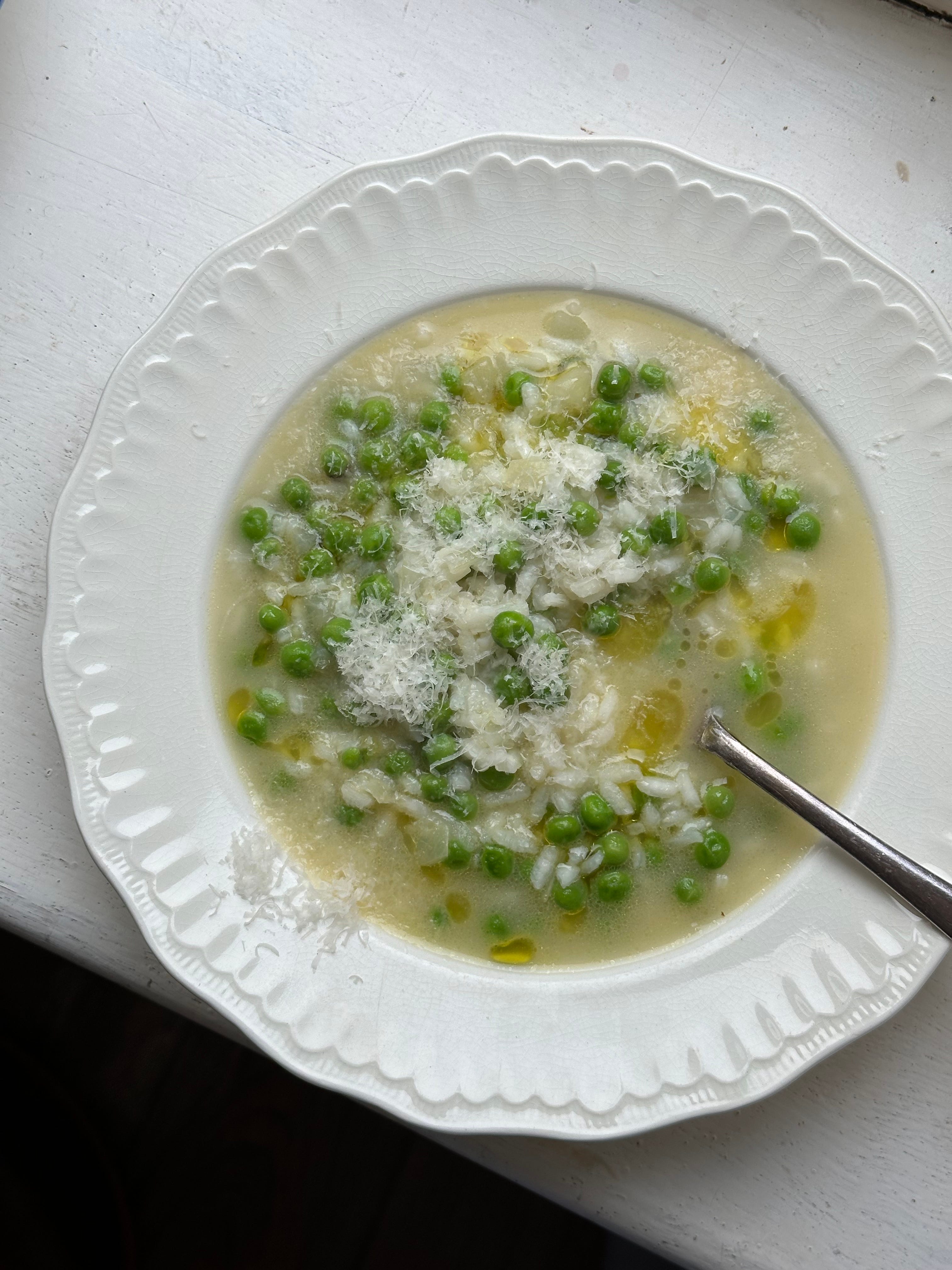 Risi e Bisi is a risotto rice and pea soup from the Veneto in North East Italy. It is traditionally made in spring with fresh, young peas, but when I was growing up my dad used to make it a lot for us all year round, and it has become a staple comfort dish for me. It’s the most warming thing, soft tender rice and sweet peas in a delicate broth perfumed with parmesan.