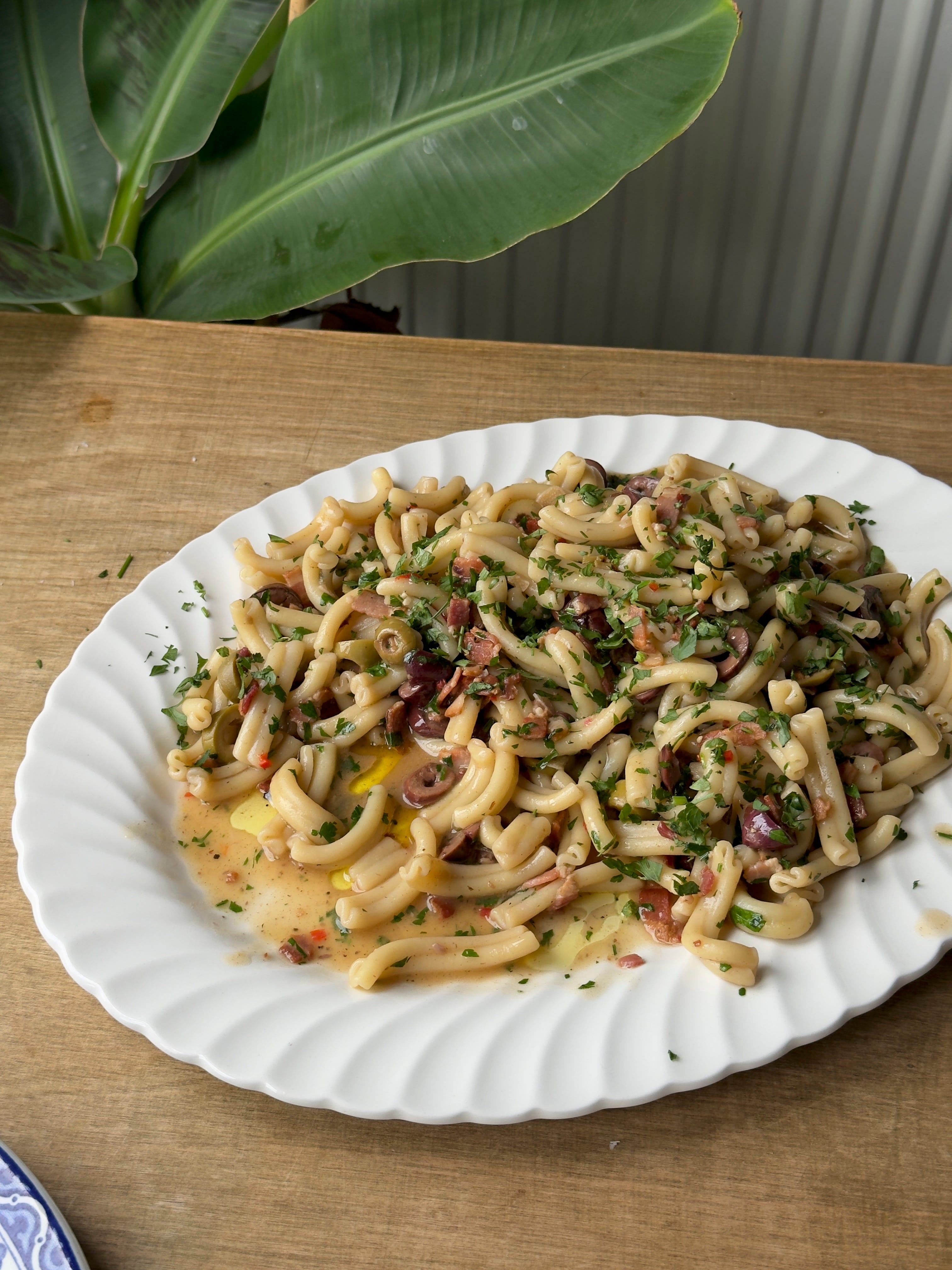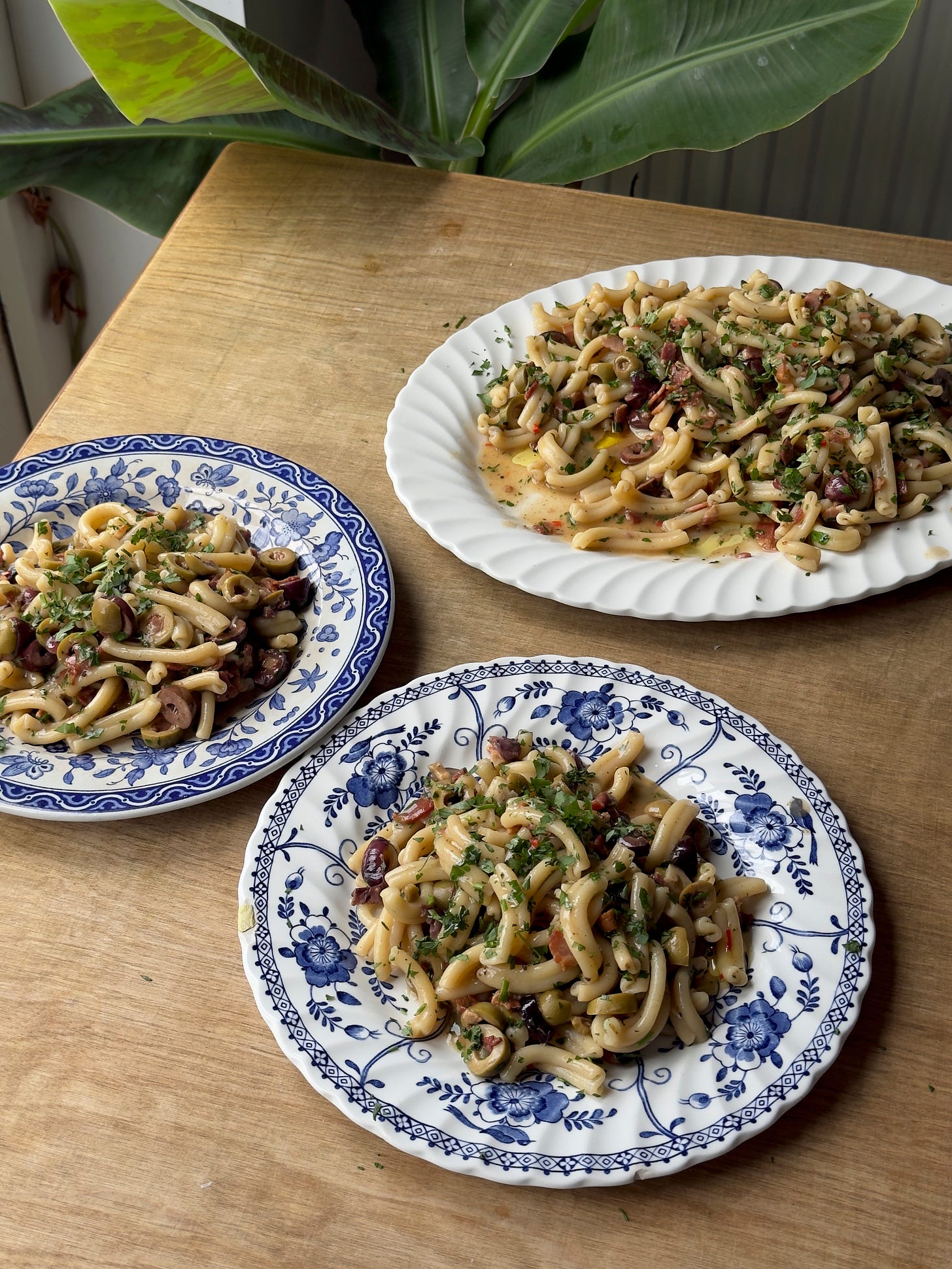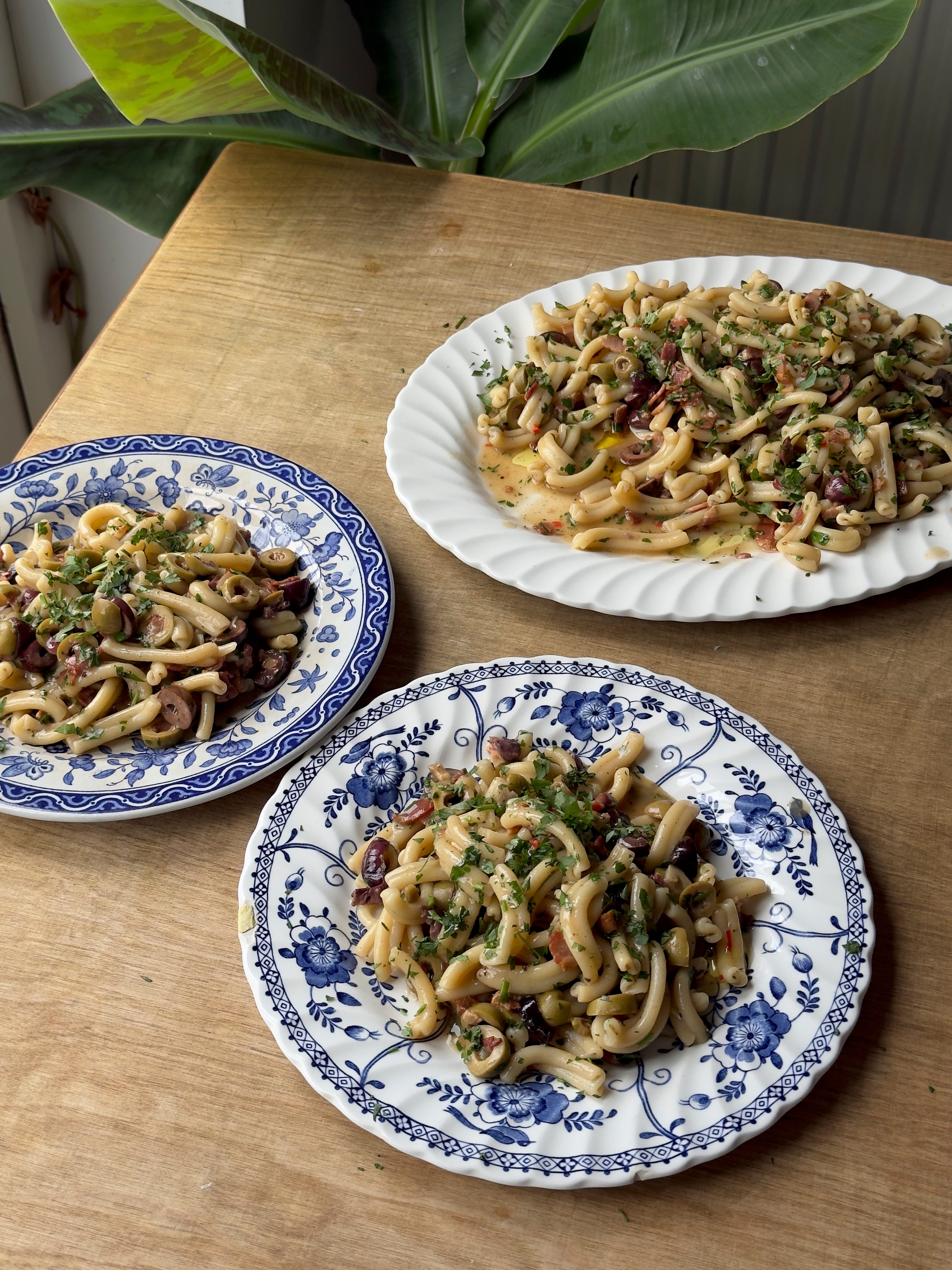 My most used olives in cooking are Kalamata, Nocellara, pitted green and pitted black and, when I can find them, Taggiasche. Apart from Kalamata I definitely trend toward Italian olives, no shade on all the other spectacular olives from the rest of the world though, it’s just what I know. I use the first two the most - Kalamata are sweet as well as sour and salty but can mellow really well when cooked. They add body without being distracting. I love them too for salads for their brightness and pop. Nocellara are a different beast entirely. They are rarely pitted, are brined but are super buttery in flavour rather than vinegary. They are great for a slower cook as well as in a salsa or garnish as they don’t overpower. I also love them in martinis. If you can’t face the idea of having to slice their cheeks off to cook sans pits, then a Gordal is a decent swap. Taggiasche are special little olives from Southern Italy, usually kept in oil but deceptively briney. They are THE best olives for Puttanesca but also for with bread and bitter Italian cocktails - if you can find them, buy ‘em.