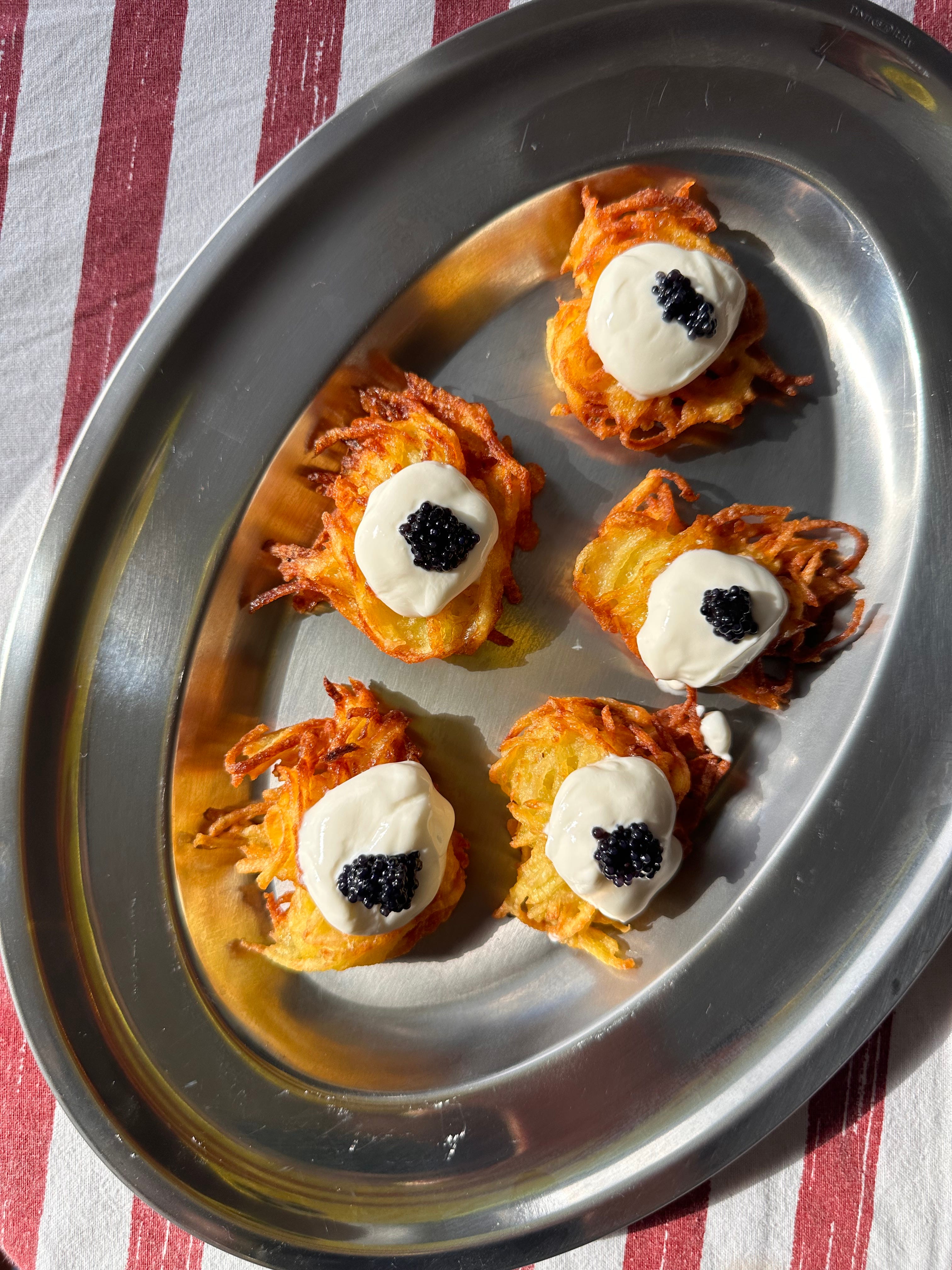 Our snack is the best frozen potato and perfect dinner party canapé: latkes with sour cream and caviar. Forget fries — you can make these days ahead, freeze them and then simply reheat in the oven to serve.