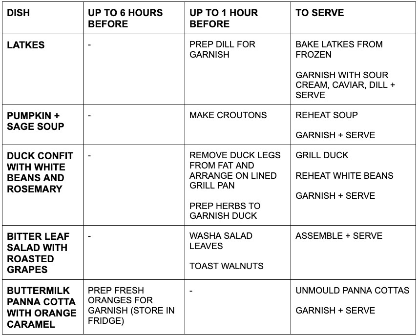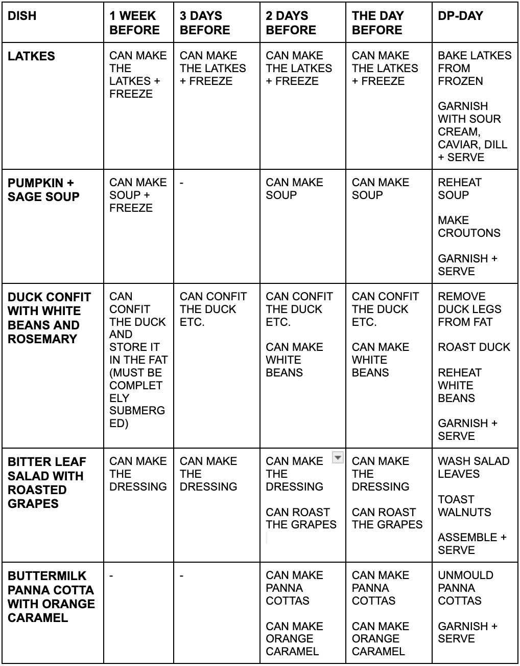 Although work might dictate that you do the bulk of your cooking on the day of the dinner party, it really helps if you can prep things in advance, either the weekend before (making use of the freezer) and/or a couple of days in advance. The table below shows you which elements can be prepared in advance so that you have a head start on the day itself.
