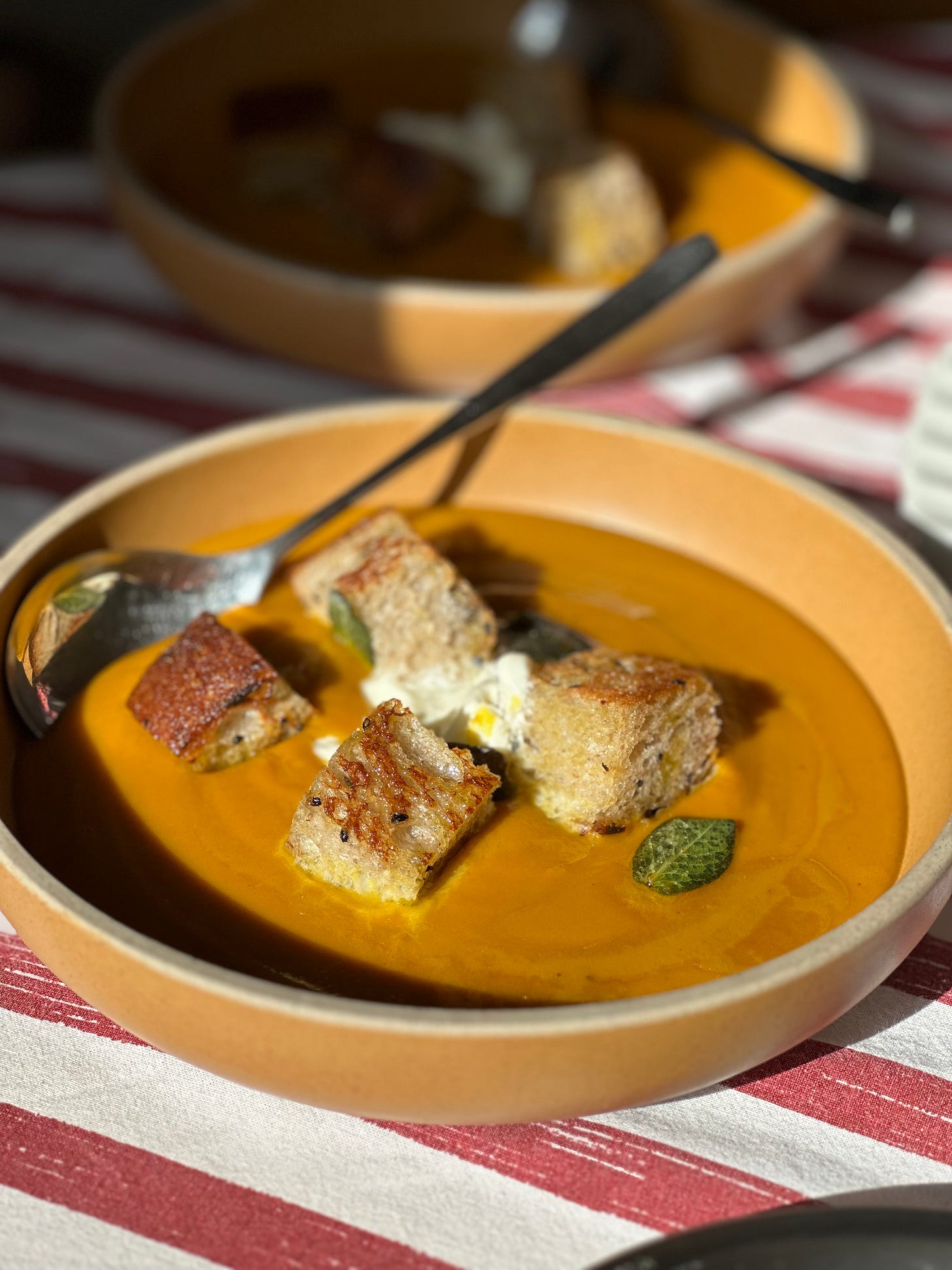 Our starter is the definition of autumn cosiness: a pumpkin and sage soup based on a post I’m currently working on for Small Wins (‘A Simple Formula for Soup’ — coming soon!).