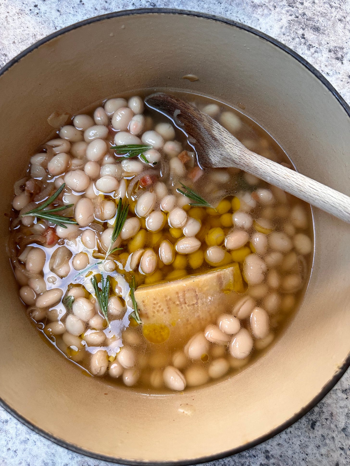 Add the drained beans, chicken stock, parmesan rind, olive oil, rosemary and salt. Bring to a gentle simmer, reduce the heat and allow to bubble gently for 30 minutes. Place aside until ready to serve, or allow to cool before storing in a sealed container in the fridge.