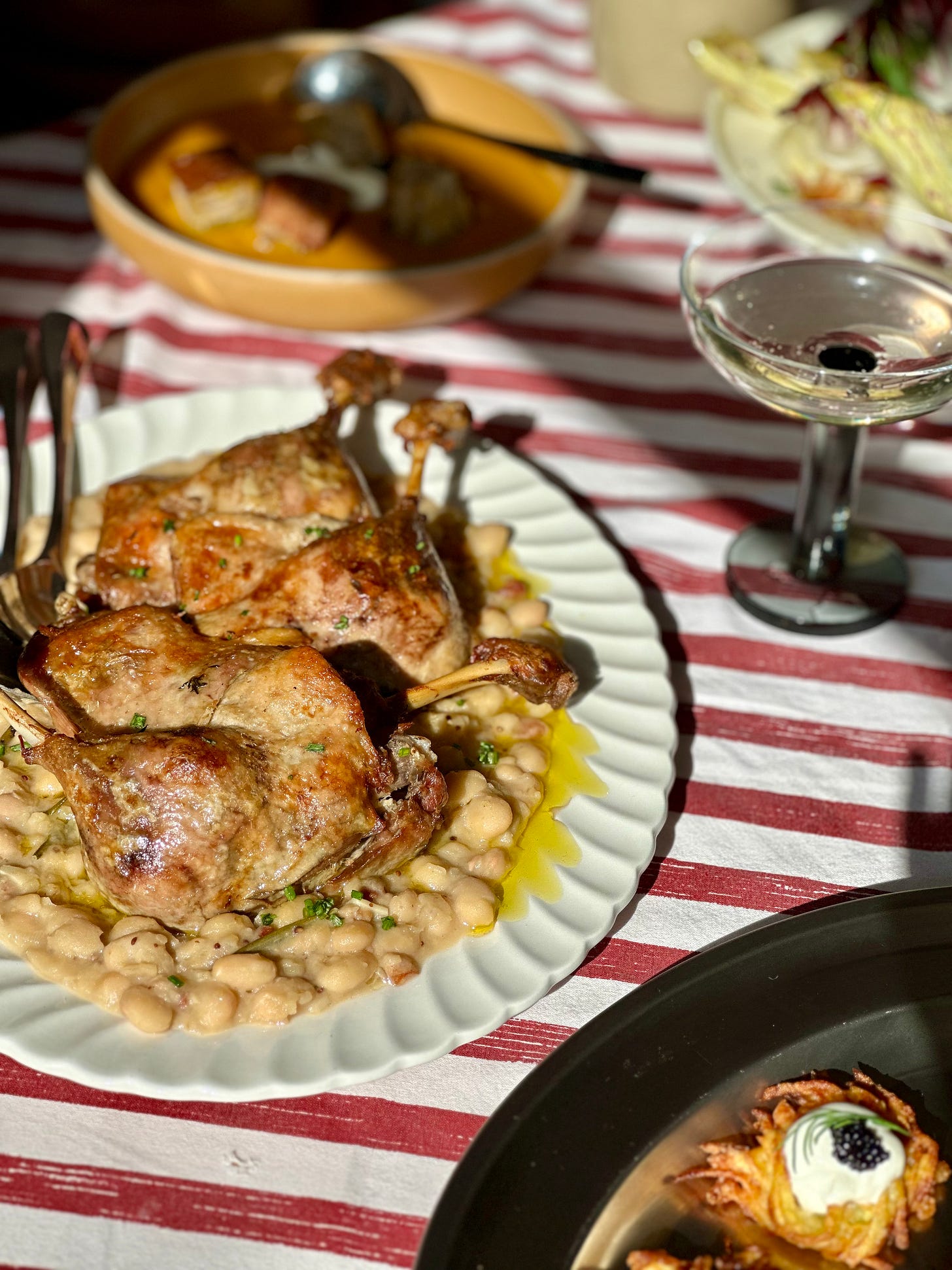 For our main event, it’s the simplest slow cook: duck confit! For ages I assumed the duck confit served in bistros across Paris was somehow complicated — something to be reserved for professional chefs. The opposite is true: it requires just THREE ingredients (including the salt!) and is such an easy, foolproof slow-cook to do at home. Alongside, we’re serving some comforting brothy white beans and a bitter leaf salad with roasted grapes (plus the best dressing in the world).